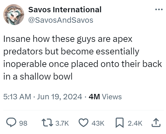 Listen… we too are apex predators, but honestly, we're pretty sure that if some giant creature suddenly picked us up and plopped us down in a giant bowl, we too would be somewhat bamboozled. Giant humans lying in there with our eyes wide open and limbs askew.