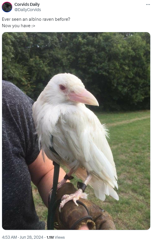 We can honestly say that, even with all of our time writing for Animal Comedy, we have, in fact, not seen an albino raven. And we have seen a lot of albino animals in our time. This might be one of the most interesting albino animals that we have ever come across, it's that unique.