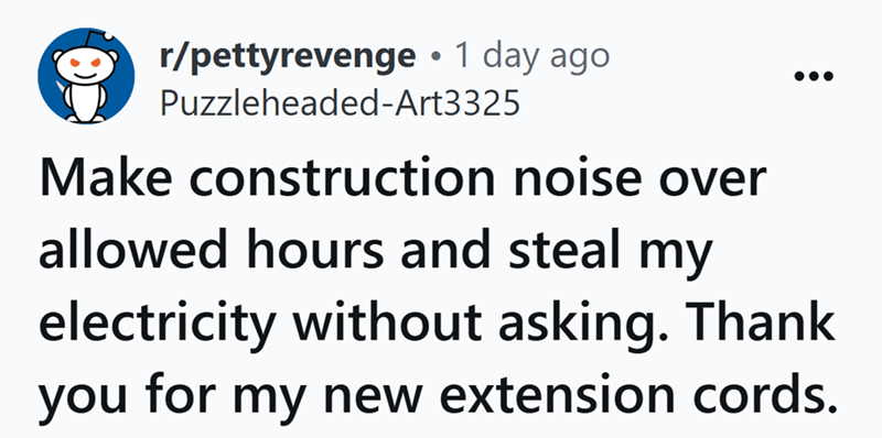 Neighbor gets ultimate revenge on entitled construction workers who constantly break noise rules and steal electricity from his outdoor outlets: 'Cue the whining and complaining'