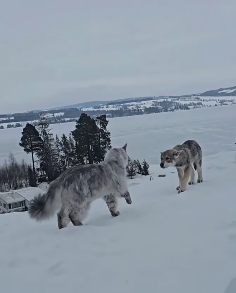 Isn't it crazy that they're practically the same size? It shows how big maine coons are and also how big wolves are when compared to normal dogs. We want our cat to become best friends with a wolf. That's like a dream come true!