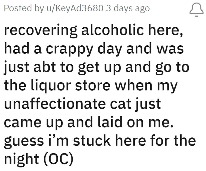 And clearly, this cat knew that it was needed. For real. For all we know, this cat might have literally saved your life that day. It loves you, and you obviously love it. Because if you didn't, you would have taken it off your lap and gone on about your business. But you stayed. And we wish you both many happy and healthy years together.