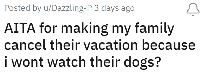 And to think that on top of asking for so much, refusing to get an actual dog sitter, they would blame her for not going on vacation, think that she is the one who is unreasonable, say they were "blindsided" by her refusing to do it, and be so selfish and entitled about the whole thing… yeah, no, we're on her side.