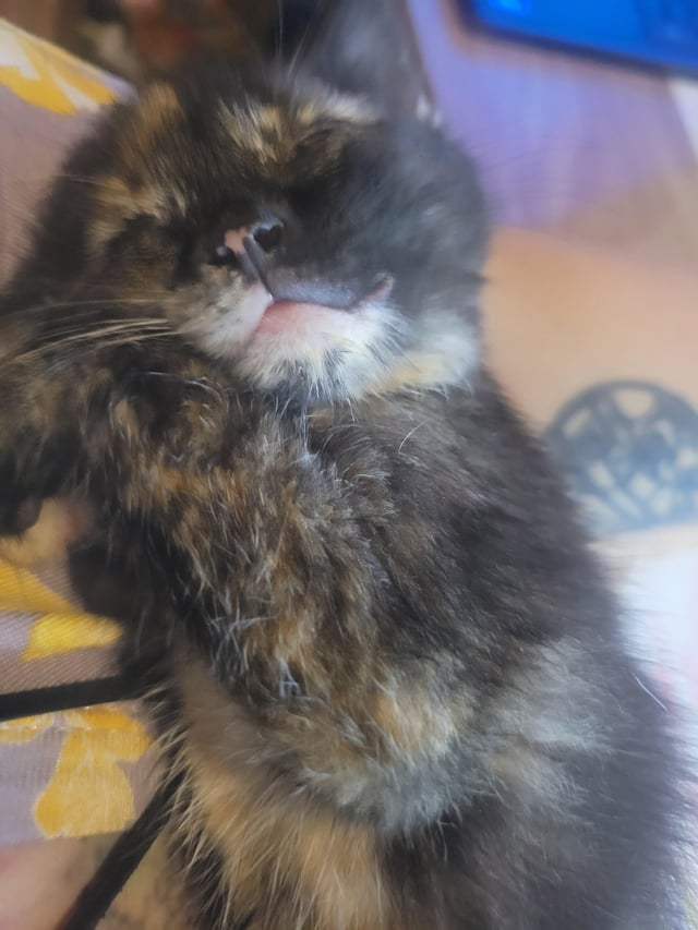 "I heard a noise in the garage yesterday morning and this little baby leaped into my arms and hasn't left me since. Last night she slept on my face."