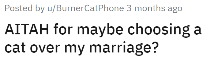We can practically hear the pain in this wife's voice, the years of possible gaslighting. We don't know what she has gone through with him over the years, but we are thankful for her cat. Because it seems that there is one line you cannot cross in a marriage, and that is the cat line, and we're glad the kitty is there to finally open this wife's eyes.