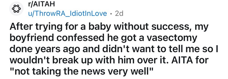 Man Confesses That He Got A Secret Vasectomy Years Ago, Admitting the Truth Only A Year After Pretending to Try for a Baby