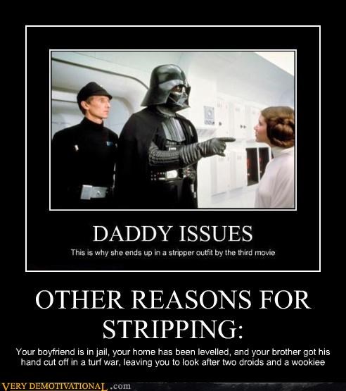 OTHER REASONS FOR STRIPPING: Your boyfriend is in jail, your home has been levelled, and your brother got his hand cut off in a turf war, leaving you to look after two droids and a wookie
