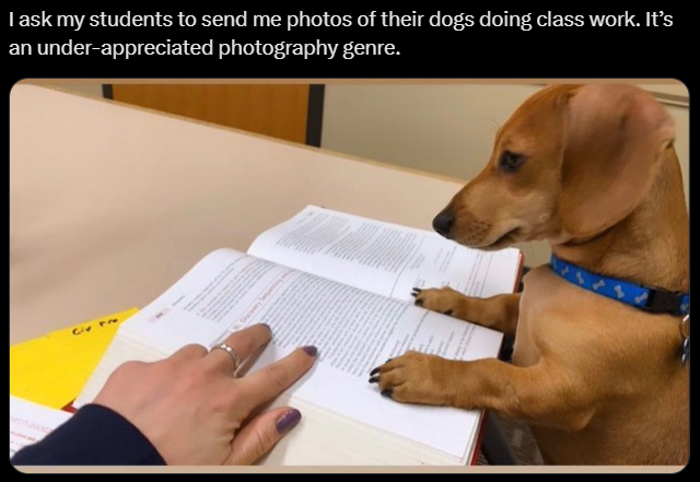No truer picture was ever taken. This smol yet sophisticated chihuahua student is up with the sun to attend class. We appreciate her. She's amazing and deserves even the big dog's treats.