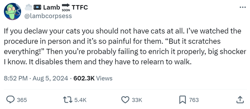 "But it scratches everything" is like- the worst excuse ever to declaw a cat. If your cat is attacking people… hurting them, you still should not do it, but we could at least understand why you would think about it. Scratching things… that's what cats do! Just have to get them more things to scratch.