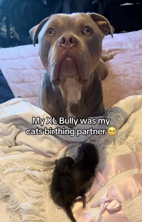 Wholesome XL Bully is the Purrfect Midwife to a Pregnant Cat, Becomes the Kitten Litter's Favorite Gentle Purrtector