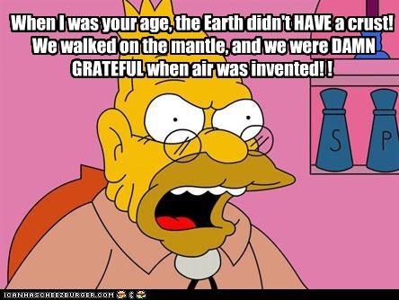 When I was your age, the Earth didn't HAVE a crust! We walked on the mantle, and we were DAMN GRATEFUL when air was invented! !