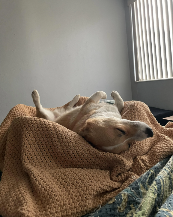 Corgis' legs are so short, so when they sleep on their backs their legs just kind of… stick out there. Their legs are dong the sticky outy very far. It's so adorable.