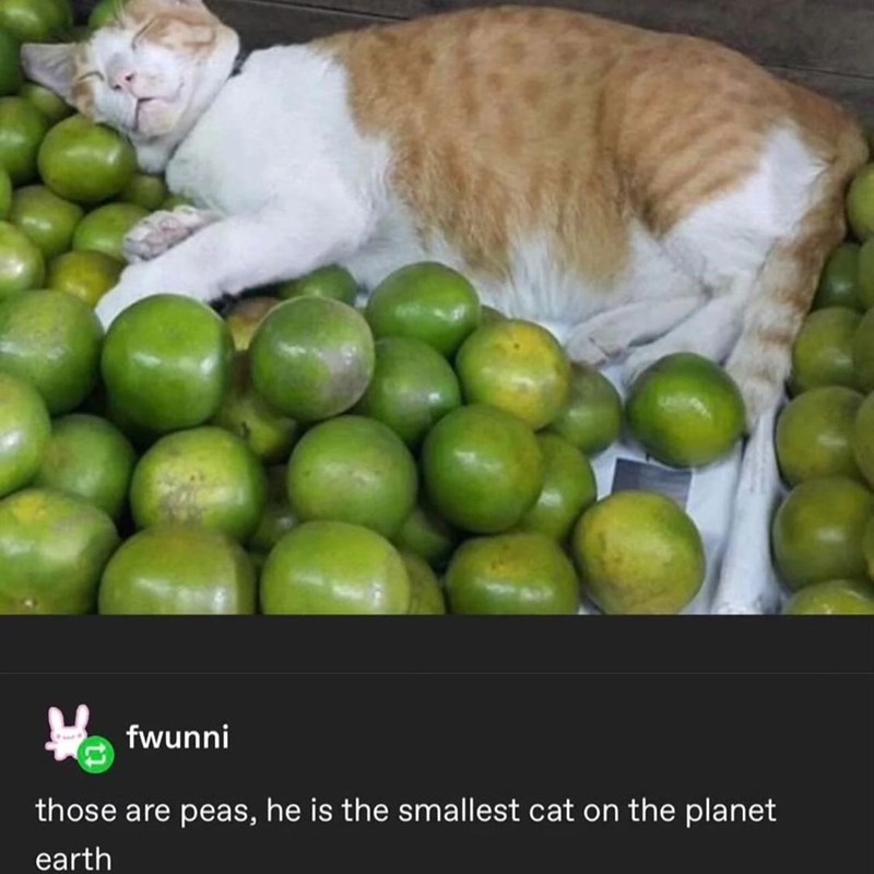 If only those were peas and this was the teeny tiniest fur baby in the world, our hearts would actually melt on the spot. That being said, to this fluffy feline's pawrents, that perception is probably true, which really does make you think about the truth behind cuteness being in the eye of the beholder of the cat child.