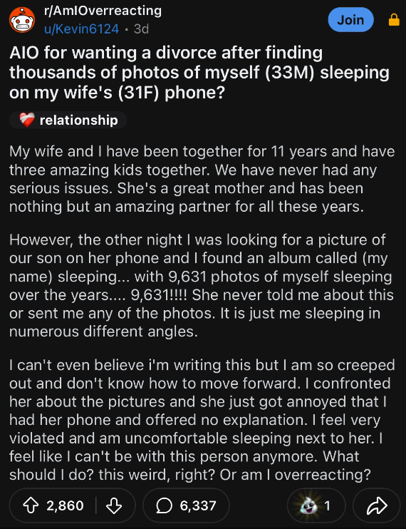 Anxious husband finds out wife has taken nearly 10,000 photos of him sleeping during 11 year relationship, freaks out and wonders about divorce: 'I feel very violated'
