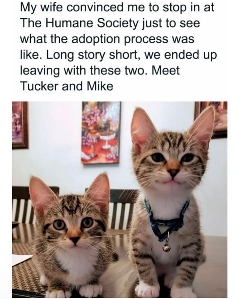 Checking out the adoption shelter is what we like to call a slippery slope. Because once you lay eyes on one cute cat, there is no chance that you will be able to resist the other twenty that are there too. Honestly, this man was lucky that he only came home with two and not ten.