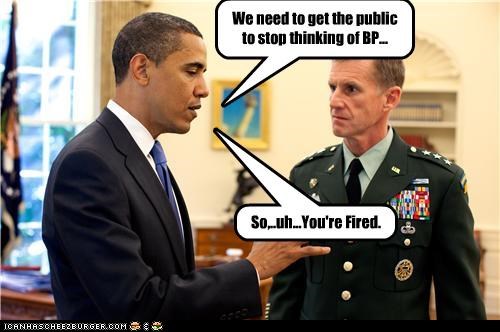 We need to get the public to stop thinking of BP... So,..uh...You're Fired. (Barack Obama and General McChrystal)