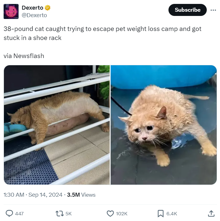 Yes. Yes, it's good for him. And laughing at him is wrong. We should not do it. No matter how funny it is. No matter how befuddled he looks in this caretaker's arms or how hilariously defeated he looks in that shoe rack. It would be rude to laugh. Being a chonky cat is not a giggling matter. It isn't.