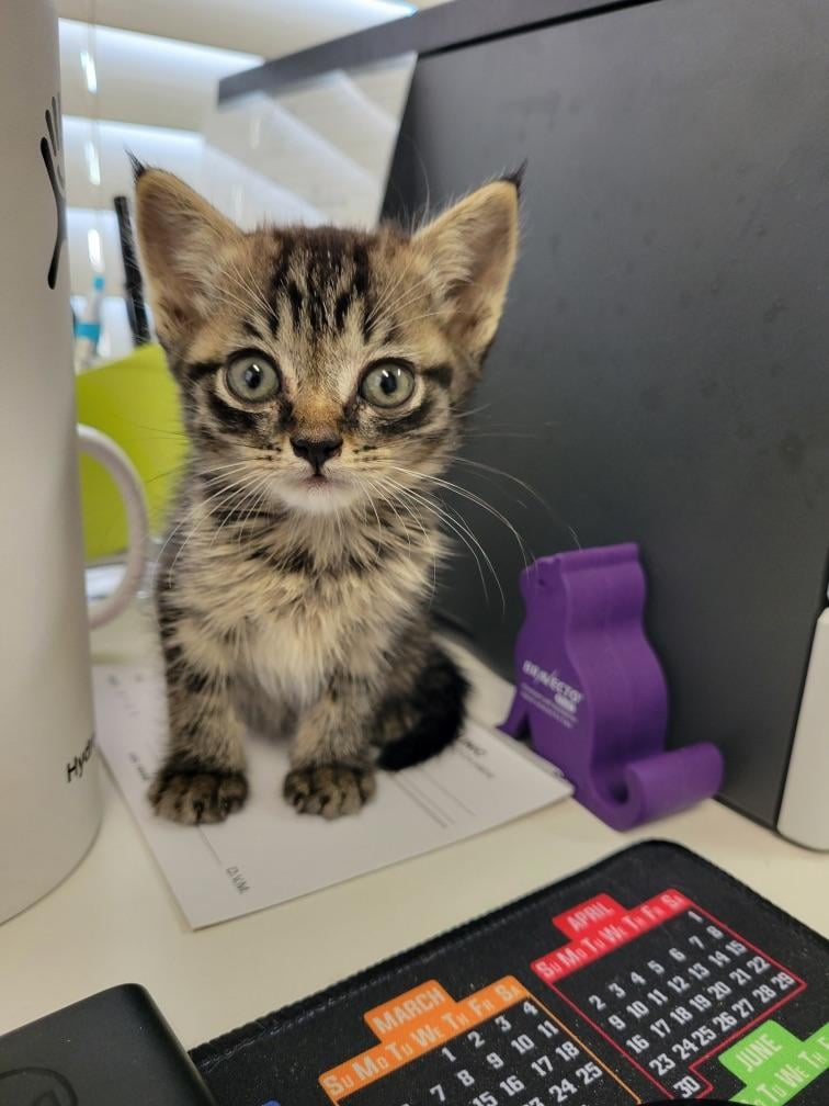 "Bean got a clean bill of health at the vet yesterday! She's growing like crazy and is approved to start trying kitten food in a slurry. She still surprises me with her big yells, and now she has the biggest purrs to match."