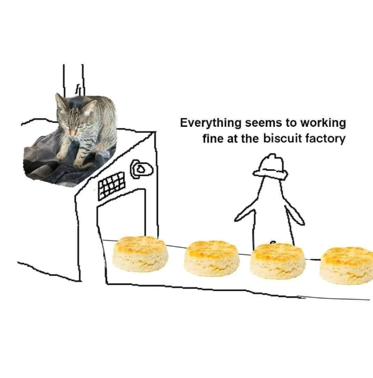 No better factory for this feline fella other than the biscuit factory. This fluffy feline friend is already making them biscuits all day long, he might as well go and make some dime out of it.