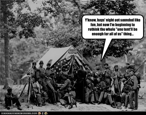 Y'know, boys' night out sounded like fun, but now I'm beginning to rethink the whole "one tent'll be enough for all of us" thing...