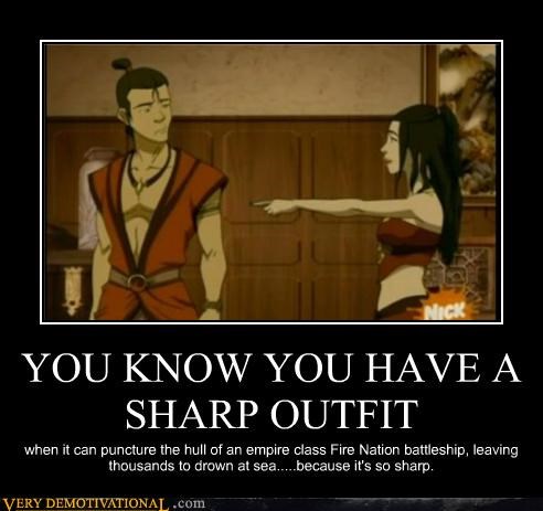 YOU KNOW YOU HAVE A SHARP OUTFIT when it can puncture the hull of an empire class fire nation battleship, leaving thousands to drown at sea, because it's so sharp.