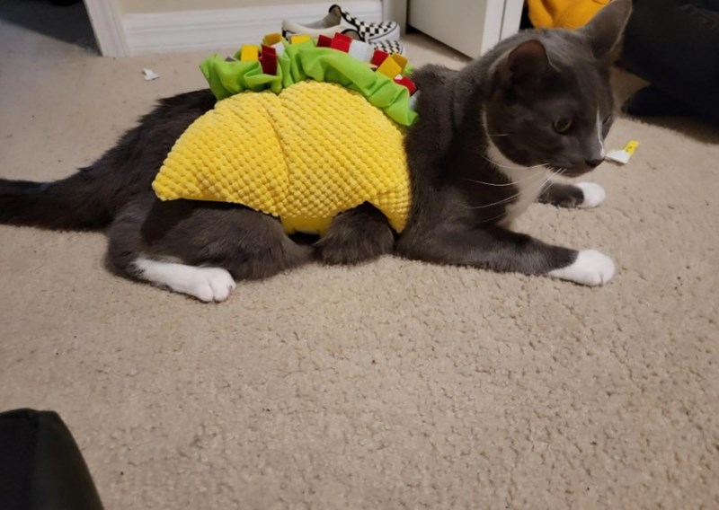 We're not sure why, but we've suddenly got this weird craving for tacos. You know, just your classic taco with some healthy stuff in it - lettuce, chopped tomatoes and onions, guacamole, a house cat. Furreal though, this cat costume is seriously adorable, and whoever made it deserves a round of a-paws.