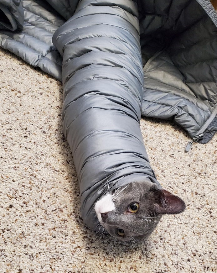 This cat deserves an award, because they're actually playing with the tree tower that was purchased for them, and not some random box they found around the house. What they don't get an award for is their choice of how to climb the tree, which unfurrtunately got them stuck.