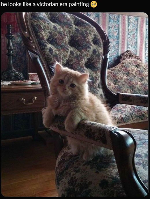 This is one of the most furrbulous cats we've seen recently. The fluffy furr, the great-grandma throne, the floral pattern on the wall, everything that frames this cat as royalty is appreciated. We feel feline better already.
