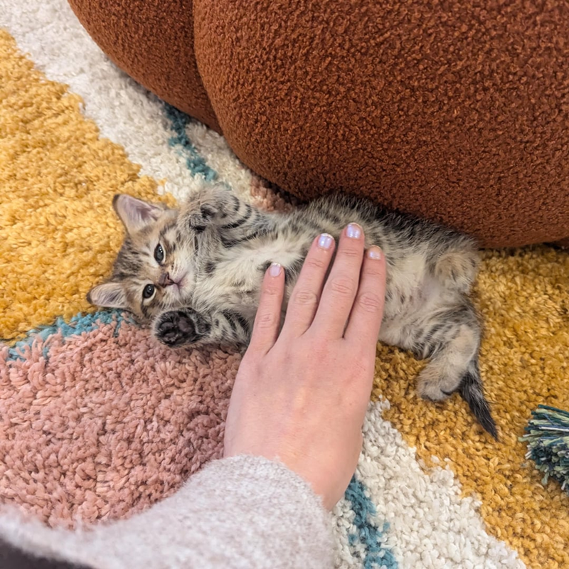 "Boyfriends mom saw this little girl THROWN out of the car while moving. She stopped and grabbed her up and got clawed in the face for her trouble. After a trip to the pet store for kitten vittles and toys we brought her home. She was filthy and covered in fleas. She had a Dawn bath and is currently snoozing on my belly. She will be treasured. Her tentative name is Marla Singer."