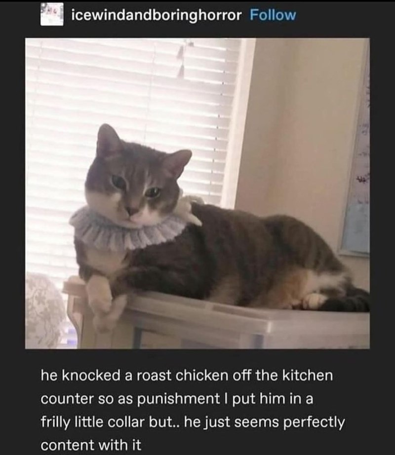 The real reason that this petulant cat child has committed a crime of such proportions is because he knows that what you really need is a cute cat borger and not some fangled rotisserie chicken. So it is of little wonder that he is pleased with his frilly little collar, to him, it is a representation of his excellence.