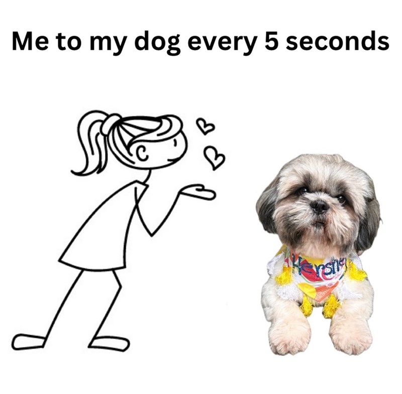 "Look at you just laying there, **muah** I blow a kiss in your general direction". "Oh, doggo, you're so sweet shopping water from the bowl, **muah** **muah** **muah**". "Wow my dog is so cute when he literally does nothing **muah** **muah** **muah** **muah** **muah** **muah**".