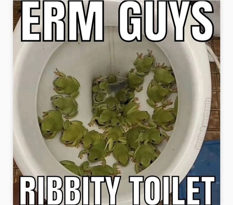 Ah, a perfect depiction of the modern day struggle. In the absence of hoomans frogs rose up and controlled the world, developing major cities and infrastructures, as well as the internet and social media. Resulting in the natural progression that would lead them to the ribbity toilet, it is good to know that we would both make bad choices.
