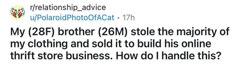 Woman's Brother Steals Her Clothes to Sell in His Online Thrift Store, Dad Sides with Brother and Threatens to Kick Her Out if She Files Police Report