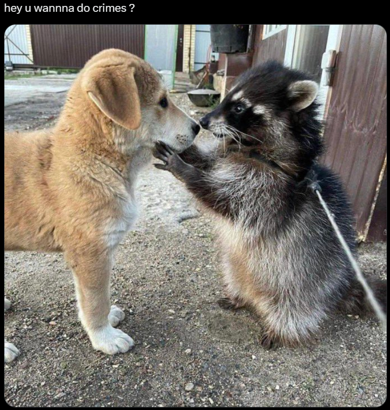 Real rambunctious feral friends do crime together. Real rambunctious feral friends help each other to make trouble. It's random, but it's raccoon, it's raccoon spirit. Befriend a raccoon, you'll have a fellow trouble maker for life.