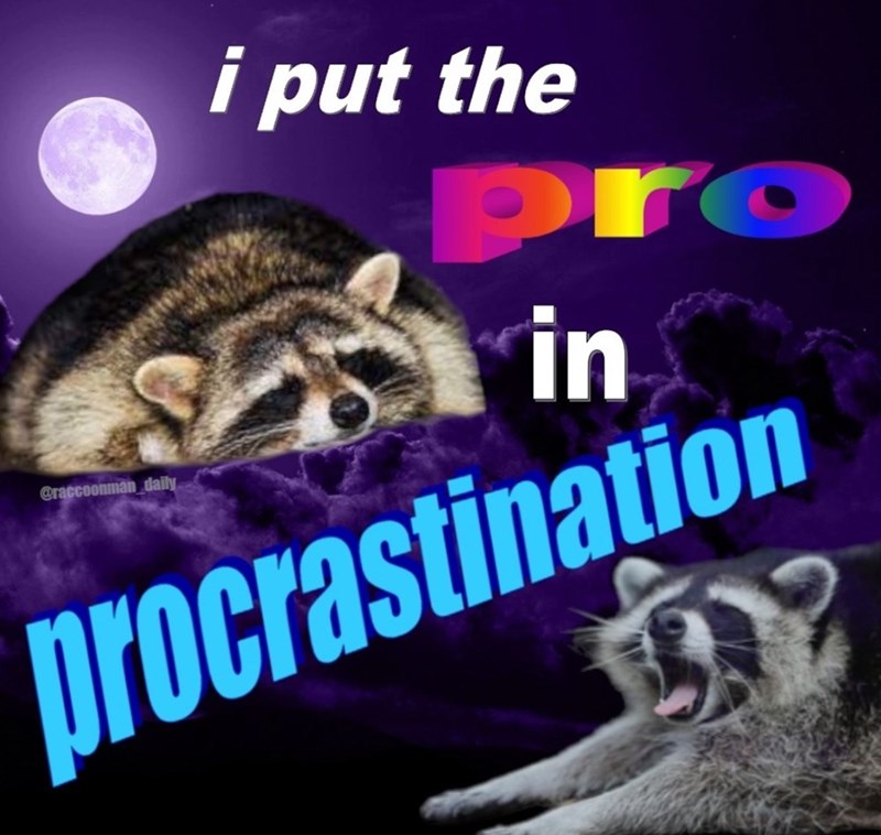 Raccoons are so nice, they put the Pro in Procrastination, because we couldn't stop writing it as Pawcrastination. We're just like that - animal fanatics that work in writing about animal memes, This is how we write. This is how we talk. Don't judge us, you're here, you probably do the same. Pawbably.