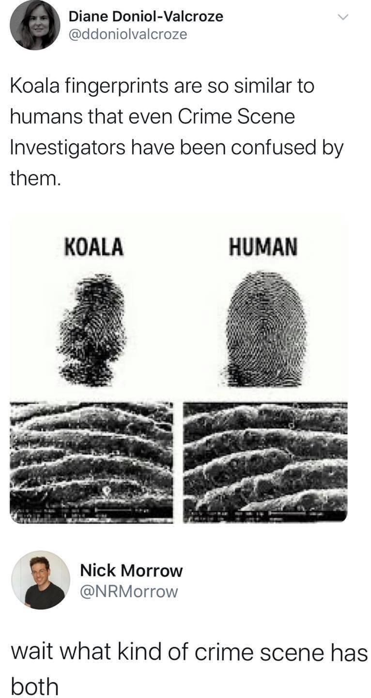 Whatever crime scene it is that involves both… we want a TV show about it. We want at least twelve forty-minute episodes, and we want a whole chase after the koala, whether it did it or not. This would be epic.