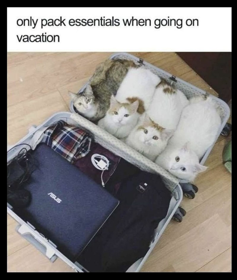 Are you packed? Let's see, you have your laptop, a few shirts, a charger, Polina the Precious, Goober the Grump, Manfred the Magnificent, and Holly the Wholesome. Good, you're all set and ready to go.