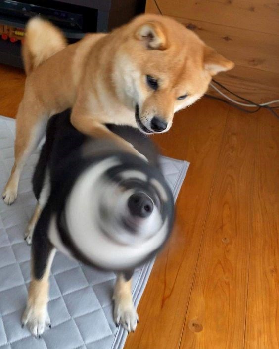 Behold - two Shibas. One is a doggo, and the other is a tornado. One rides the storm, and the other is the storm itself. One woofs, and the other winds.