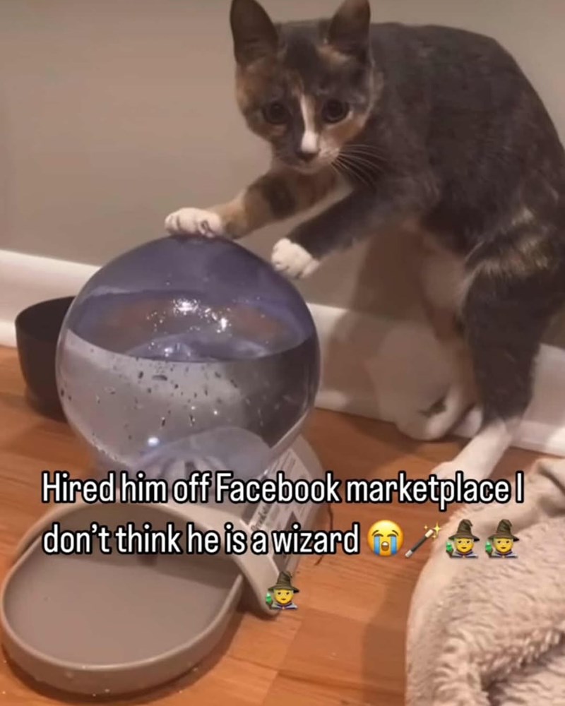 POV: you when you dramatically run away from the family function to disassociate from the drama going on underneath you, so you run to your room and play pretend with your purring pal. Though one must wonder why in a situation where one could imagine any kind of backstory they'd like, that this cat was hired from Facebook marketplace.