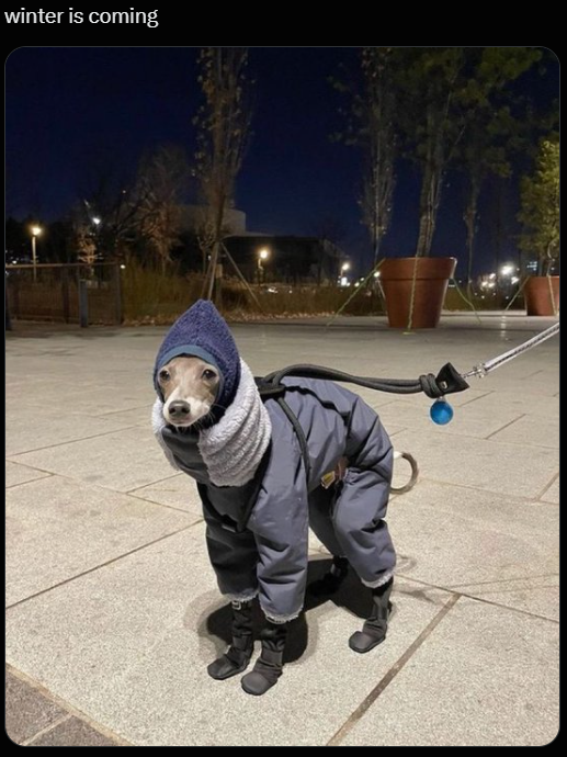 If your dog is rather fuzzy and not as fluffy - dress them up correctly. Look how absolutely pawdorable this little buddy looks with his coat and smurf hat. We want to cuddle him until he's warm.