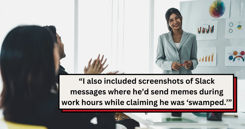 Employee gets even with lazy ‘office golden boy’ by tracking his every move via spreadsheet, then ‘accidentally’ presents the document during a routine meeting