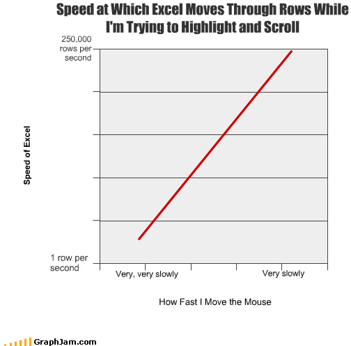 Speed at Which Excel Moves Through Rows While I'm Trying to Highlight and Scroll Very, very slowly Very slowly How Fast I Move the Mouse