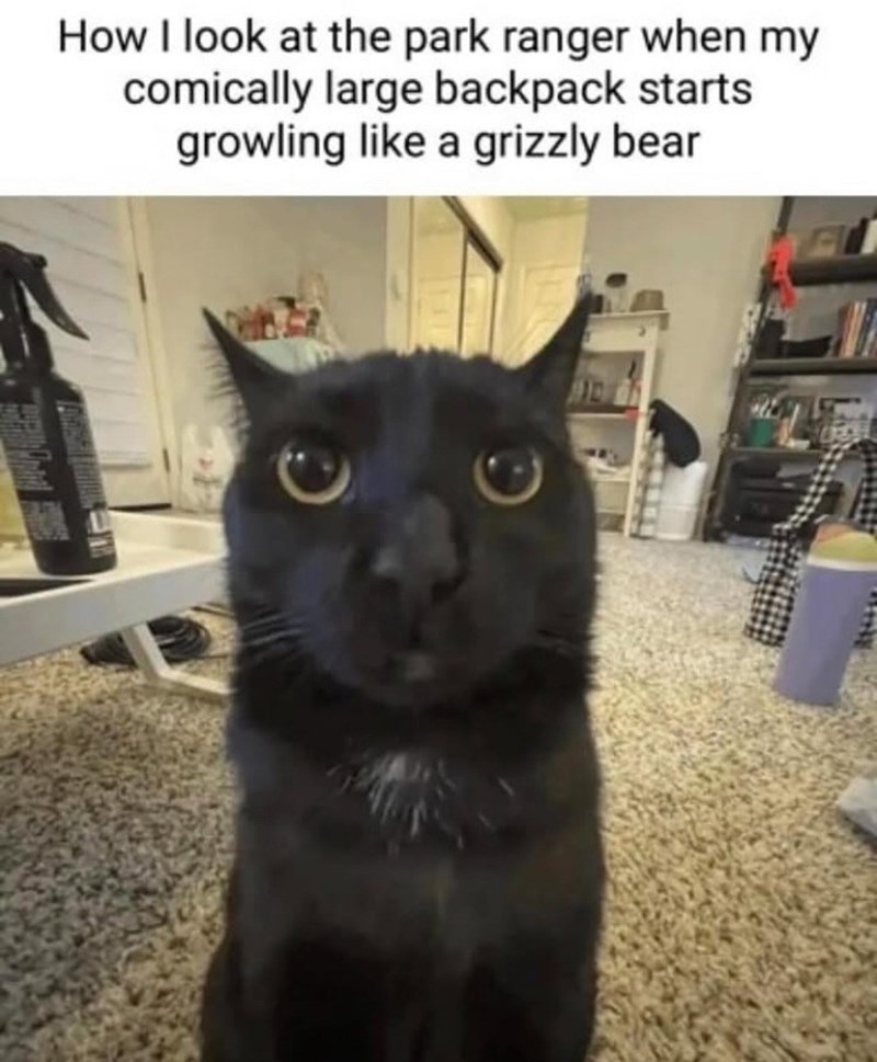 "I apologize, good sir, but i have absolutely no idea what you mean by 'you have a grizzly bear in your backpack'. I am simply on a hike, enjoying nature. Purrhaps you should remove the beef jerky from your pocket before you make other people's bags start growling…"