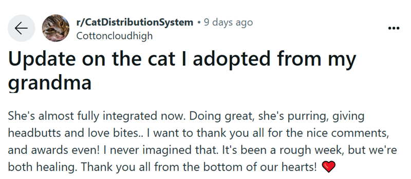 Even if all occurred so fast, this commenter is right - the reduction of suffering is a very important factor here. And it carries on to this story, of the granddaughter adopting her grandma's cat - they both reduce each other's suffering of their shared loss, and can comfort each other.