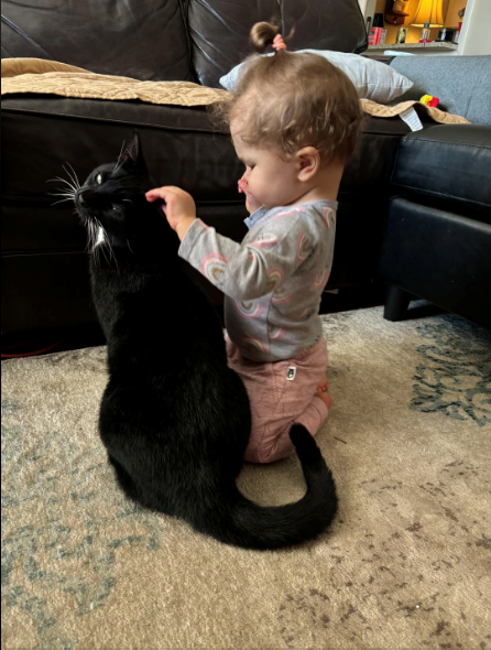 Do you think the cat is adopting the hooman child because they know that the daughter is blind? We can't say for sure, but cats do seem to have a sixth sense about these things. They know when we're sick and come and lay on us, they know when we're hurting somewhere and love to make biscuits on the sore spot, so maybe they can tell that this little girl needs their help. The daughter will be fiercely protected, that's for sure!
