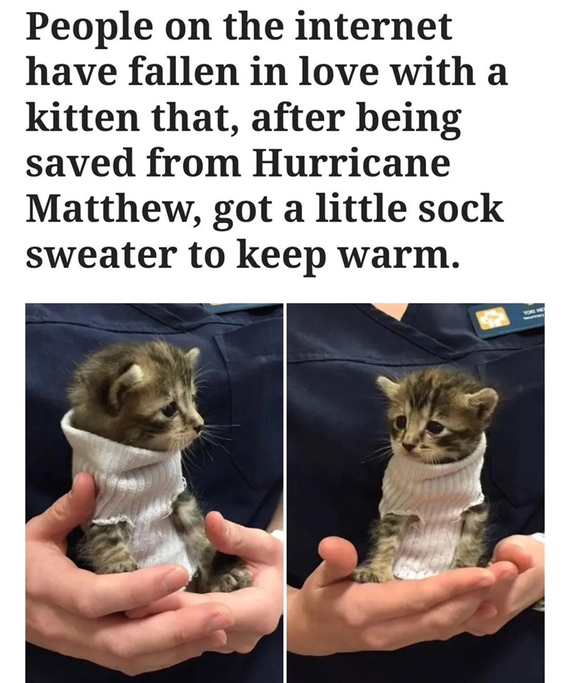 And much like this kitten was reduced by hoomans from the horrors of such a sinister storm. He is now returning the favor to us hoomans by being the cutest little feline fashion model that the internet has ever laid eyes on. So feast your eyes and fill your soul with his fluffy fuzzy goodness.
