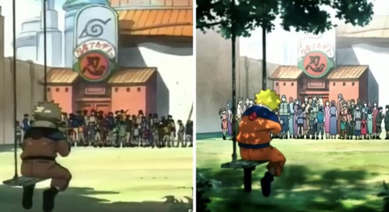 The animation in Road to Naruto is definitely sharper and smoother. The eyes especially have so much more depth and color. However, the grittiness of the original animation works better to illustrate the violent world inhabited by these ninjas. Also, the perfect crispiness of the OVA detracts from some of the more emotional moments. For example, in the panel with Naruto crying, the left is certainly “uglier” than the one on the right, but it conveys his despair far more effectively.