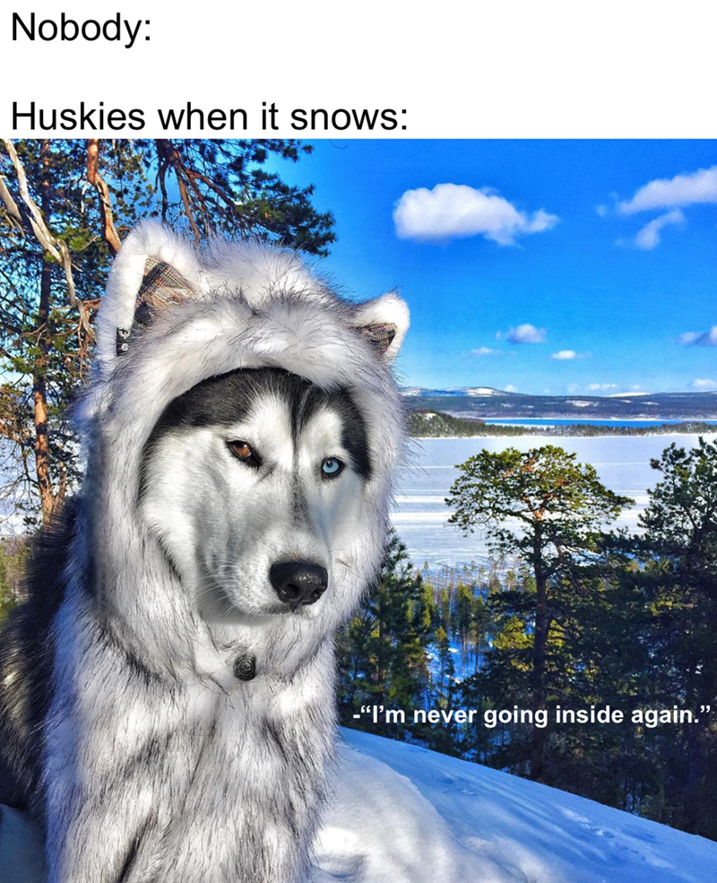 It's howlarious to be watch a husky in their element—the snow. They thrive there! It doesn't matter if they have been outside all day, they never want to go back inside when it snows. Their body and fur is designed to regulate their heat and keep them warm, so winter is their favorite time. Seriously, walk a husky when the snow is starting to melt and they WILL find the one hill of snow left and go for it. You won't be able to leave that area for the rest of the day, maybe even the night…