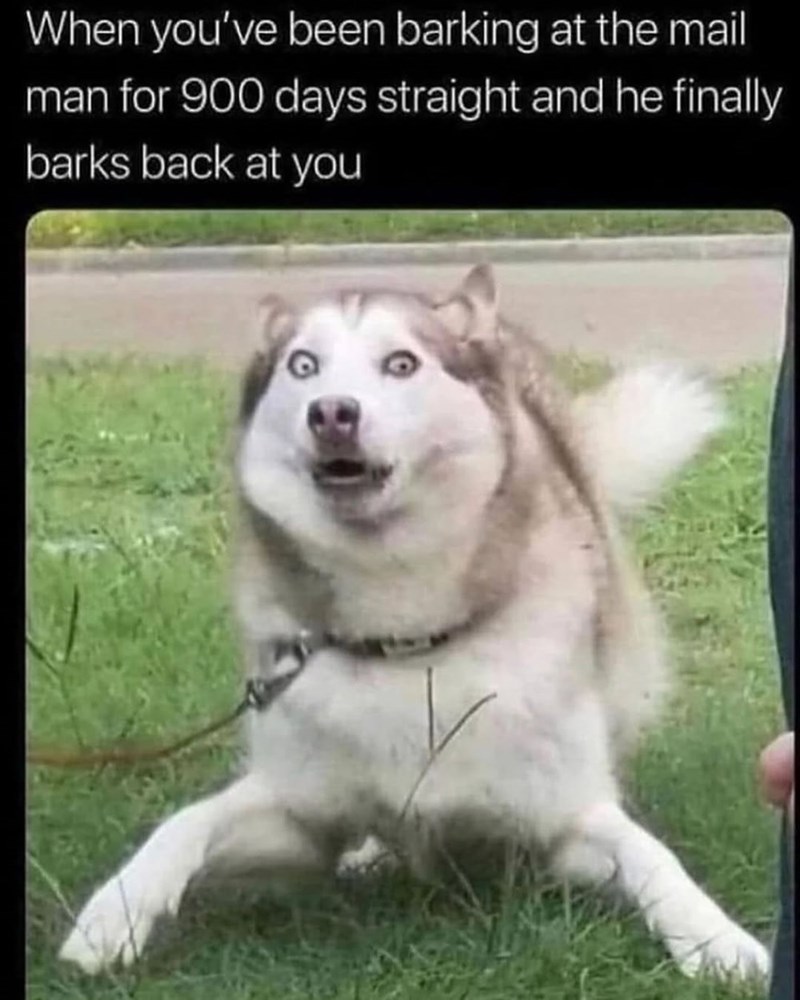 When you've been barking at the mail man for 900 days straight and he finally barks back at you