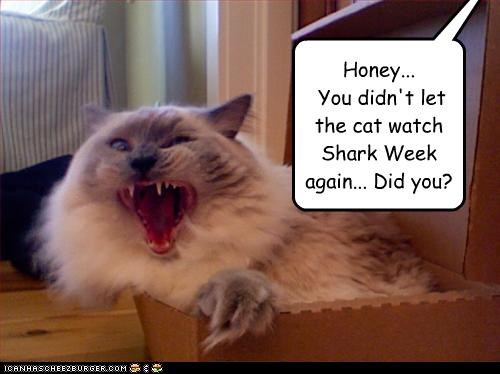 Honey... You didn't let the cat watch Shark Week again... Did you?