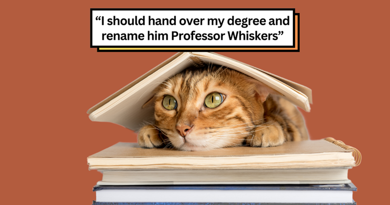 If anything, it’s time to proudly hang a tiny diploma on the wall. After all, Professor Whiskers has earned it! Finishing Claw-ma furr Laude! Top of his class! Tabby-dictorian!